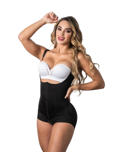 Body cachetero con control de abdomen, elaborado en lycra bidireccional de control fuerte, moldea la silueta y estiliza la espalda gracias a su excelente cubrimiento, su diseño senos libres realza y centra el busto, cuenta con encaje siliconado en la parte inferior que evita que se enrolle o se marque al usar prendas ajustadas, realza los glúteos de manera natural y cuenta con broche de 3 posiciones en la parte inferior que se ajusta a la medida de la cadera, lleva cremallera frontal con broches internos que facilitan la postura y generan mayor comodidad, tirantas ajustables que se adaptan a tu medida. Short levantacola invisible a la cintura con control de abdomen, cuenta con encaje siliconado en piernas, no se marca al utilizar prendas ajustadas, caucho ancho siliconado que evita que se enrolle, diseño interno que realza los glúteos de manera cómoda y natural. |