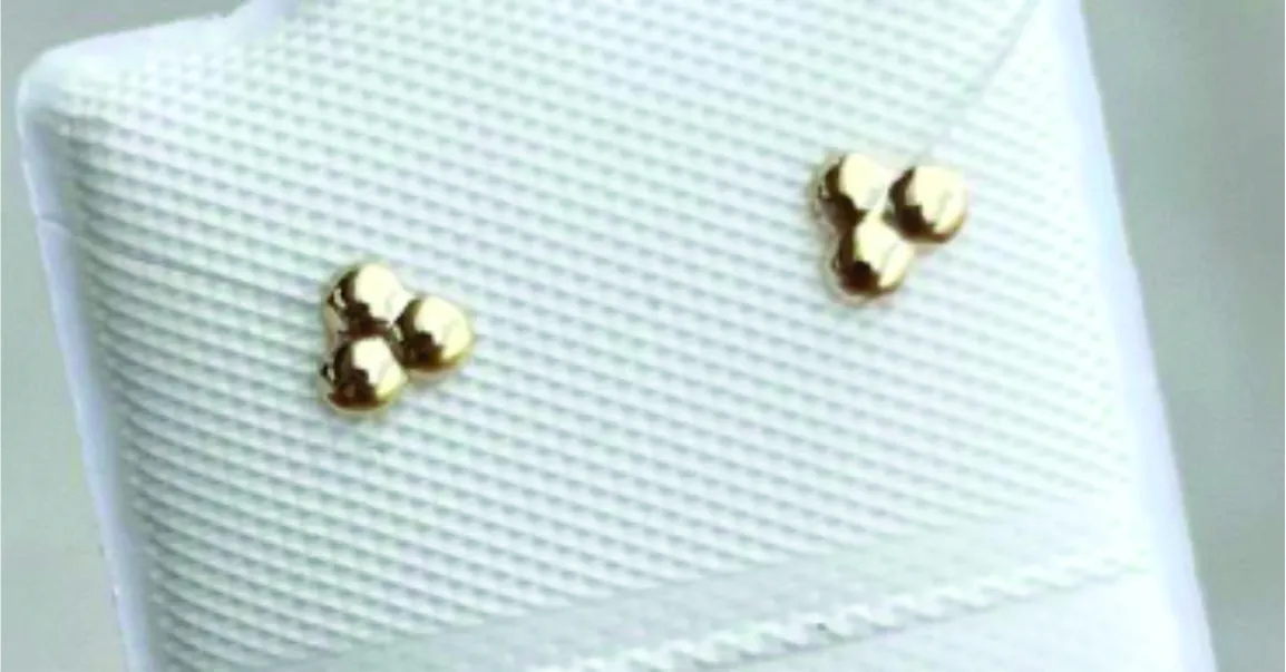 |  | Tres puntos, Estos elegantes aretes de oro de 10 kilates son el complemento perfecto para cualquier ocasión especial. El brillo y la durabilidad del oro de 10 kilates garantizan que estos aretes se mantendrán hermosos por muchos años. Su diseño clásico y atemporal los convierte en una pieza versátil que puede ser usada tanto de día como de noche. Ya sea que los uses para darle un toque de elegancia a tu outfit diario o para lucir radiante en una ocasión especial, estos aretes de oro de 10 kilates son una elección segura. Su tamaño y forma son ideales para todo tipo de rostros, y su cierre de seguridad te brinda la tranquilidad de que no se perderán. ¡Hazte con estos espectaculares aretes de oro y realza tu belleza con un toque de lujo! |