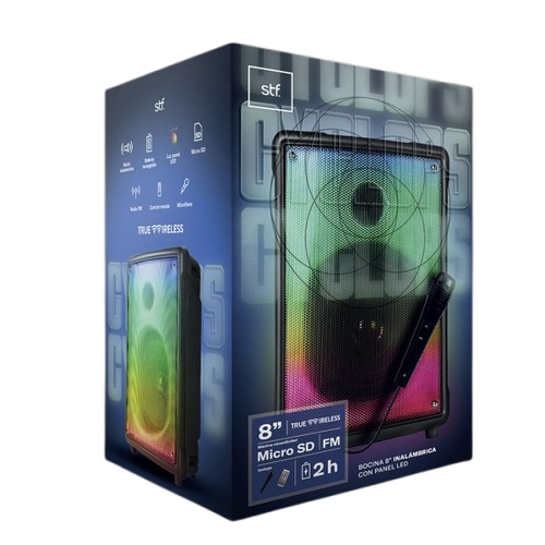 CONEXIÓN INALÁMBRICOTRUE WIRELESSCONECTORVERSIÓN 5.0SImicro USB (carga), 6.3 mm (mic), micro SD (memorias), 3.5 mm (audio).MEDIDA DE LA BOCINALUZ PANEL LEDRADIO FM8" (20.32 cm)SISIALCANCE INALÁMBRICOMEDIDAS DEL PRODUCTOTIEMPO DE USO10 m24.3 x 36 x 20.4 cm Peso 2.06 kg2 horasPOTENCIACONTENIDO DEL EMPAQUE 33 W RMS