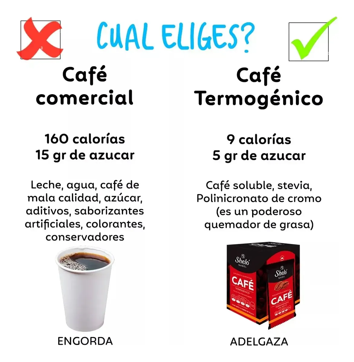Beneficios: INCLUYE 1 CAJA CON 15 SOBRES Quema grasa y baja de peso rápidamente Lo pueden consumir diabéticos Lo pueden consumir hipertensos Regular tu flora intestinal. Controlar tu peso Reducir medidas. Regular los niveles de glucosa en la sangre. Aumentar la utilización de las grasas acumuladas como reserva. Activar la termogénesis del cuerpo, ayudándote a quemar más calorías. Cuidar tu organismo de manera natural Descubre el Café Soluble Termogénico de Sheló Nabel, un producto que combina sabor y beneficios para tu bienestar. Cada sobre contiene 10 gramos de café de origen mexicano, con un nivel de tostado medio que resalta su dulzura natural. Diseñado para aquellos que buscan una opción orgánica y deliciosa, este café es perfecto para incorporar en tu rutina diaria. El aroma envolvente y el regusto dulce de este café soluble transformarán tus momentos de pausa en una experiencia placentera. Ideal paraActivar tu metabolismo, este café es un aliado en tu camino hacia un estilo de vida saludable, brindando un toque especial a cada preparación. Disfruta de una bebida lista en segundos, perfecta para los que tienen un estilo de vida acelerado. Con 15 sobres en cada paquete, el Café Soluble Termogénico te ofrece conveniencia y calidad en cada taza. Aporta energía de forma natural, ideal para iniciar tus días o como acompañante en tus actividades cotidianas. Opta por un café que no solo satisface tu paladar, sino que también respeta el medio ambiente con su cultivo orgánico. |