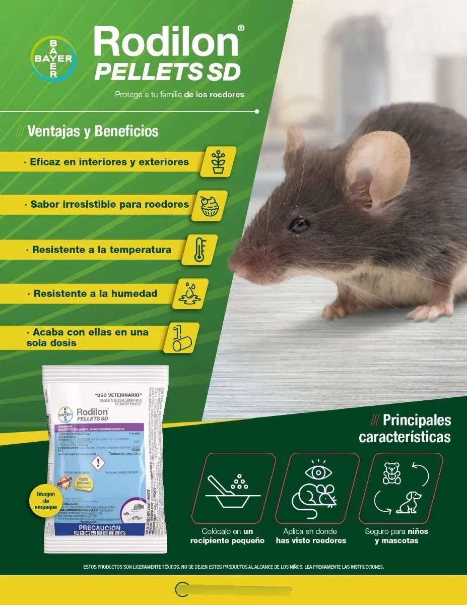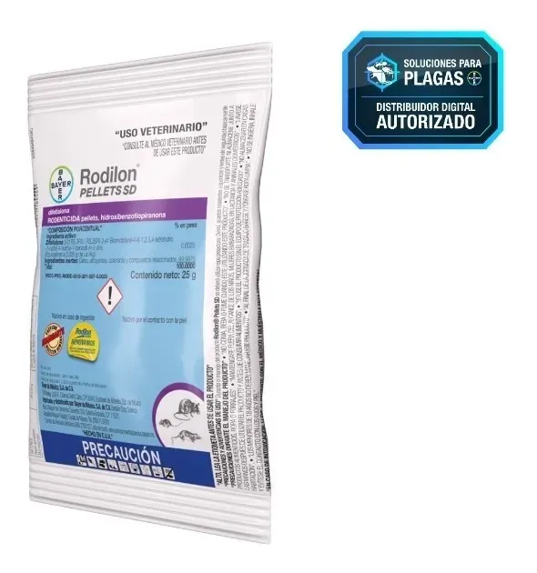 Cebo Rata Rodilon Pellets SD 25 Gramos Bayer Es un cebo, atrayente, colorante y compuestos relacionados. Rodenticida anticoagulante unidosis en pellets, con elevada efectividad para el control de ratas y ratones. La fórmula Rodilon® Pellets SD es inteligente Por su forma de acción, actúa sobre los roedores sin alertarlos, permitiendo que toda la población consuma el cebo logrando alta eficacia en el control. Uso fácil y práctico. Producto listo para usarse y su presentación en prácticos pellets, permite servirlos directamente del sobre. Por su forma de acción, actúa sobre los roedores sin alertarlos, permitiendo que toda la población consuma el cebo logrando alta eficacia en el control. Uso fácil y práctico. Producto listo para usarse y su presentación en prácticos pellets, permite servirlos directamente del sobre. |