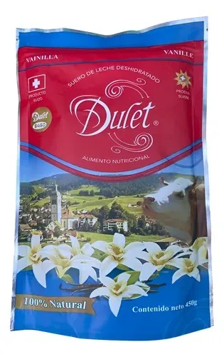 DULET es un lactosuero suizo en polvo, 100% natural, que se presenta en diferentes sabores, incluyendo vainilla. Este producto es una fuente de proteína de alta calidad, que contiene 41 bioelementos (11 vitaminas, 11 minerales y 19 aminoácidos esenciales) y se considera libre de azúcar, lactosa, caseína y grasa. Características de DULET Sabor Vainilla Origen: suizo. Formato: Suero deshidratado en polvo. Composición: Contiene 11 vitaminas, 11 minerales y 19 aminoácidos esenciales, y es libre de lactosa y caseína. Beneficios: Aporta proteínas de alta calidad, aminoácidos esenciales y bioelementos. Presentación: Viene en un envase de 450 gramos, con sabor a vainilla. Usos: Se puede disolver en agua o leche para crear un batido o utilizarse en recetas de repostería. |