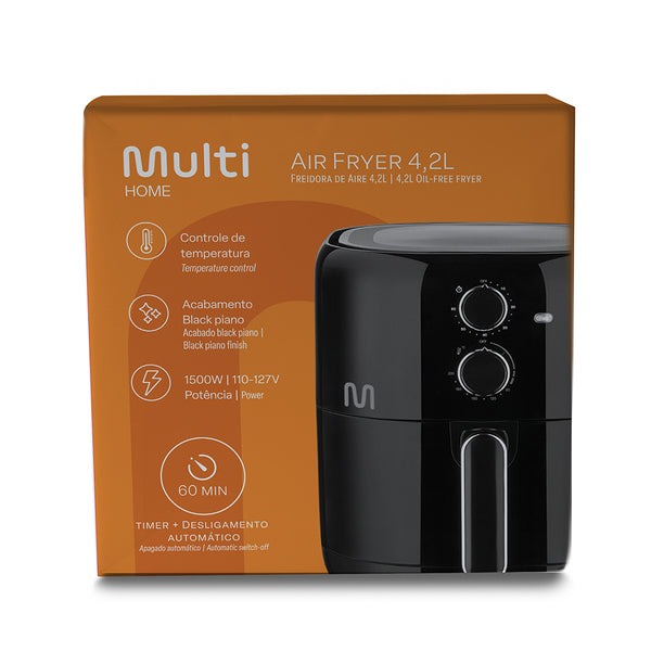 ¡Prepara comidas saludables para ti y tu familia con la Air Fryer de Multilaser! Tiene 4 litros de capacidad para freír grandes cantidades de alimentos a la vez, facilitando su preparación. Puedes hornear, freír, tostar o dorar tus alimentos sin usar aceite más que por convección de aire que proporciona el crujido de los alimentos de forma sana y rápida. Ideal para preparar desde snacks hasta alimentos como carnes y pescados. Es ideal para cualquier momento como almuerzos familiares, cenas con amigo e incluso tus fiestas. Tiene control de temperatura hasta 200°C para que puedas programar la temperatura de preparación para cada tipo de alimento, cuenta con temporizador de 60 minutos con aviso sonoro y apagado automático.