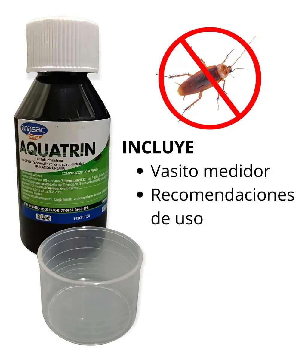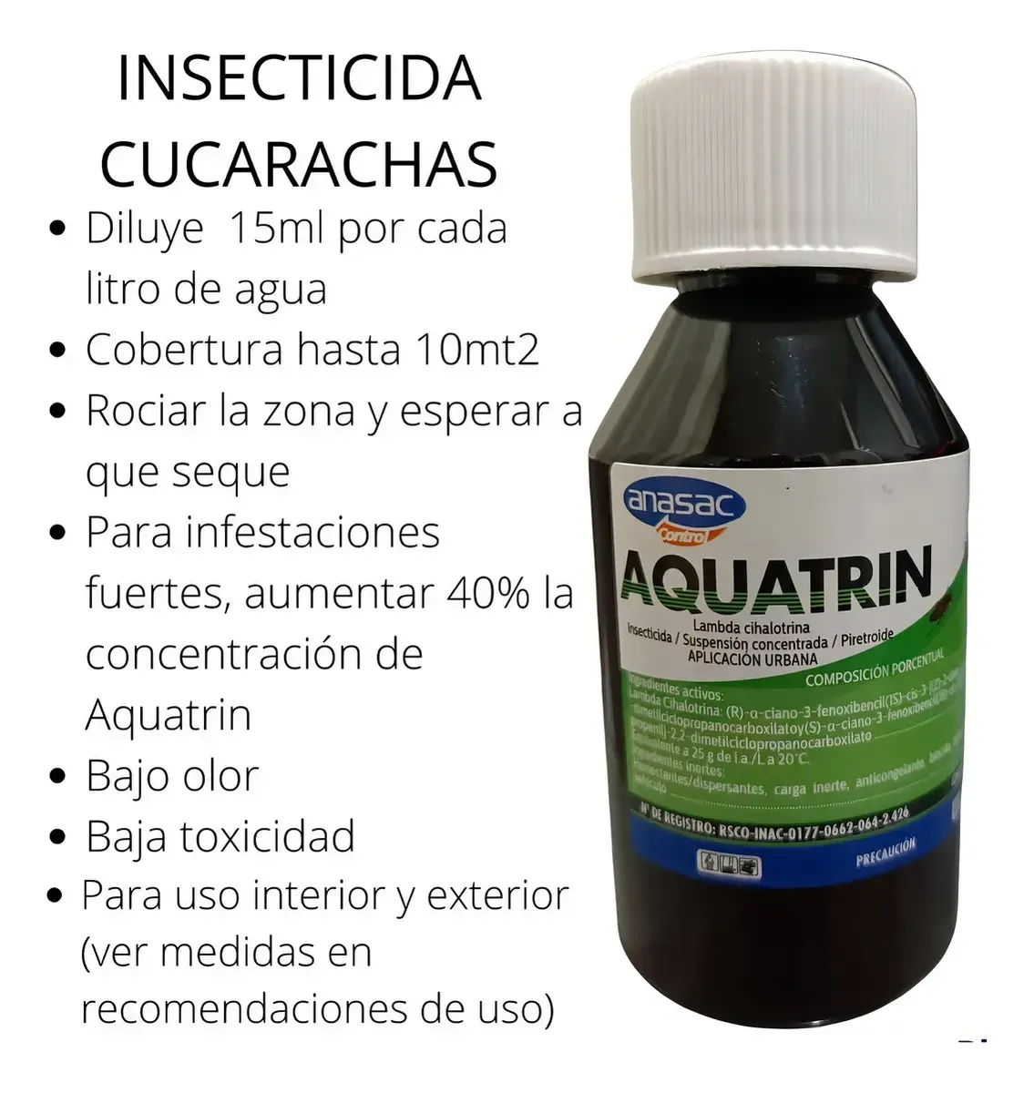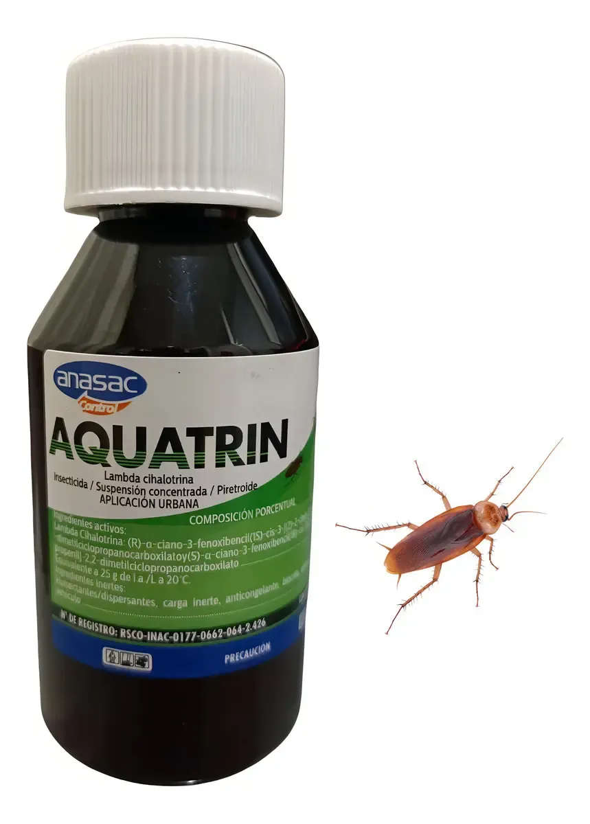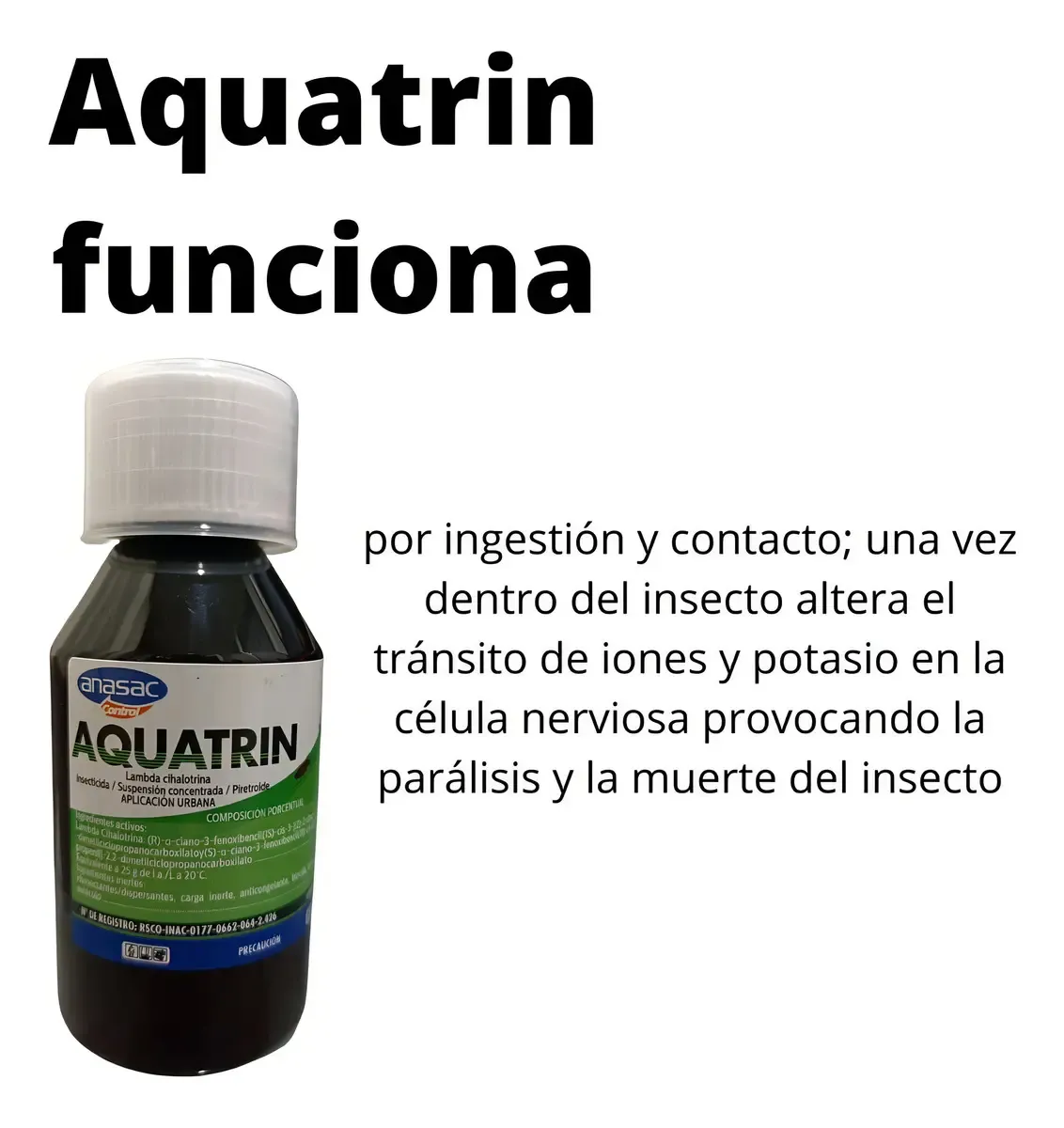 Insecticida Mosquitos y Moscas 100 ml Aquatrin Marca Anasac AQUATRIN actúa por ingestión y contacto. Una vez dentro del insecto, altera el tránsito de iones de sodio y de potasio en la célula nerviosa, provocando parálisis y la muerte. AQUATRIN puede ser aplicado en interior o exterior de casinos, cocinas, hoteles, medios de transporte, industrias, residencias, entre otros.