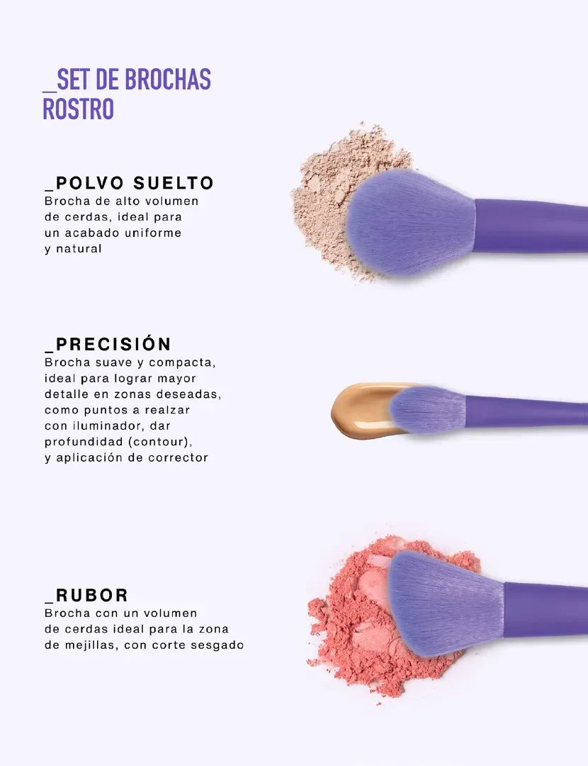 Incluye: - Brocha para polvo suelto - Brocha para rubor - Brocha de precisión |