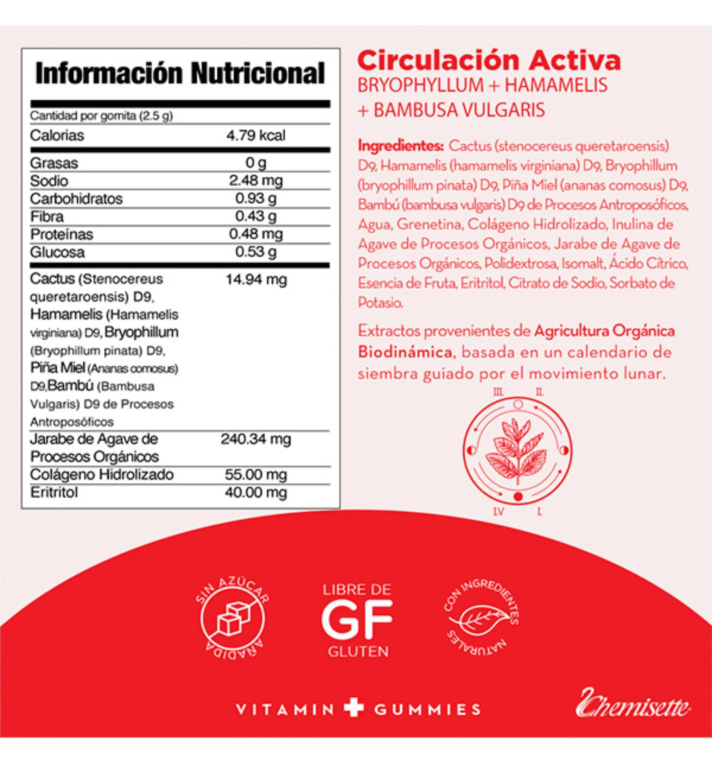 BENEFICIOS: Auxiliar en trastornos de la circulación, insuficiencia venosa o várices, hinchazón, adormecimiento o cansancio en extremidades por falta de circulación. Mejora el flujo sanguíneo de tu cuerpo de una manera natural por sus ingredientes como Bryophyllum, Hamamelis y Bambusa Valgaris. No contienen azúcar añadida, libres de gluten, sin colorantes artificiales. MODO DE USO: Masticar 1-2 gomitas cada 6 horas. Administrar a partir de los 12 años.