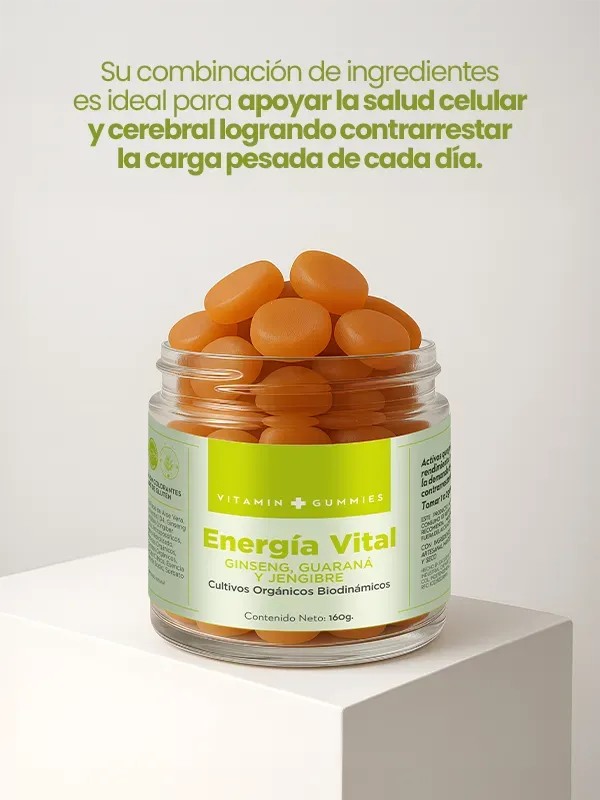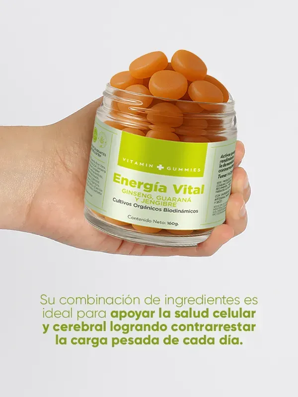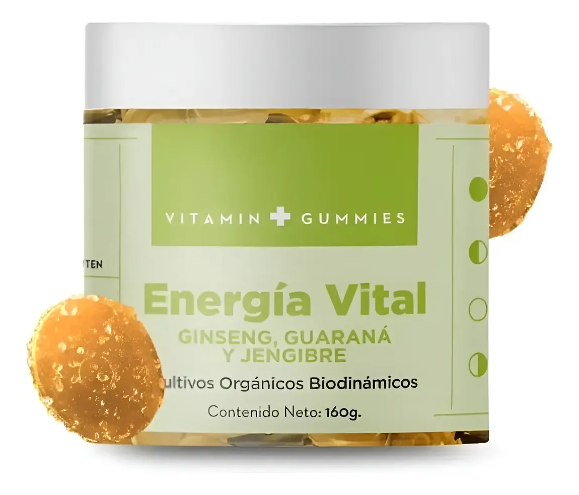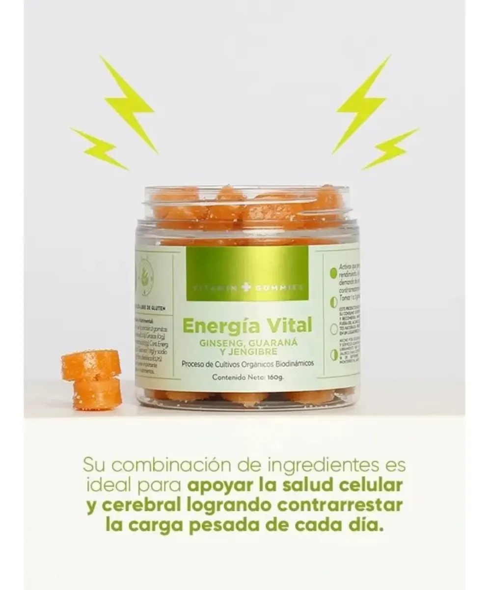 BENEFICIOS: Mejora tu rendimiento diario y aumenta tu energía combatiendo el cansancio y la fatiga de una manera natural gracias a sus activos como: Ginseng, Guaraná, Jengibre y Té Verde. No contienen azúcar añadida, libres de gluten, sin taurina. MODO DE USO: Masticar 1-2 gomitas por la mañana.