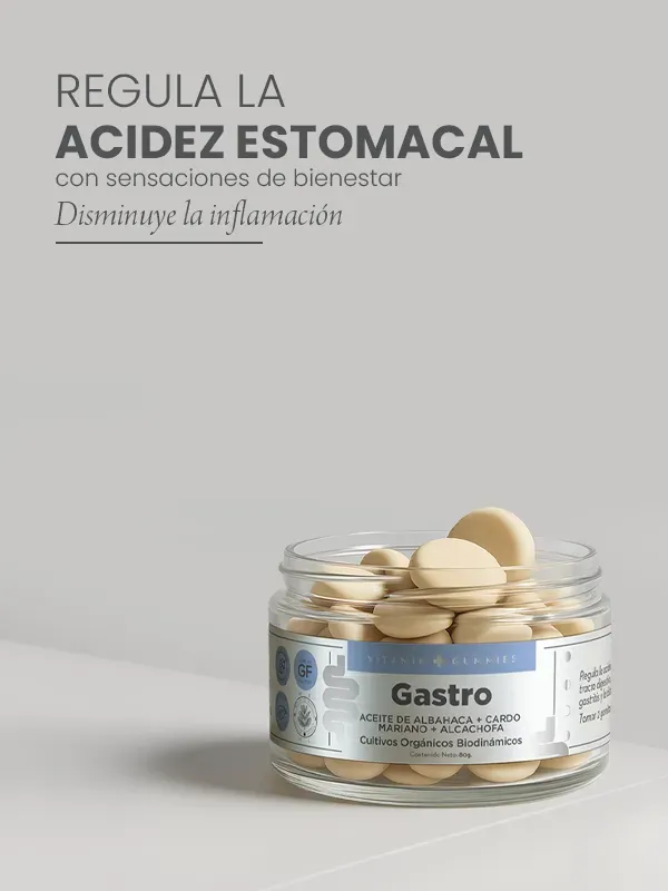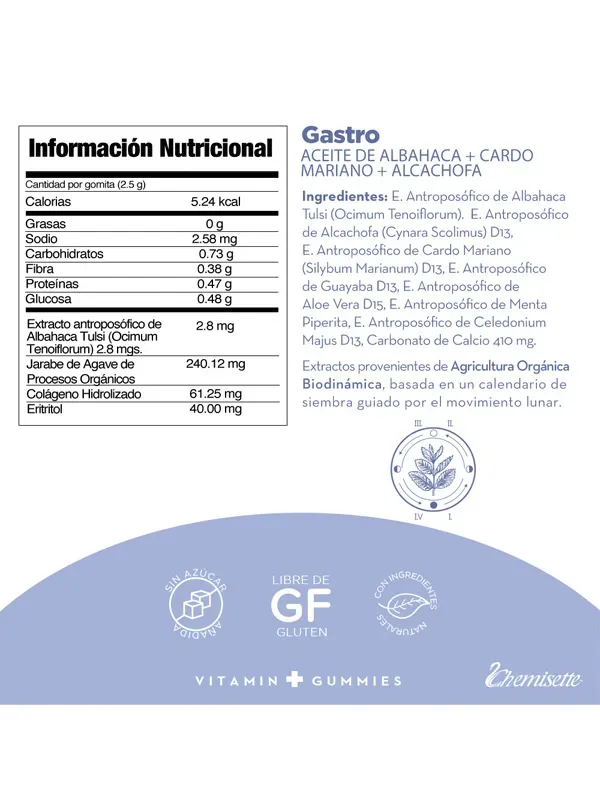 BENEFICIOS: Gomitas masticables que regulan la acidez estomacal, disminuyen las molestias por gastritis y reflujo. Hechas a través de Agricultura Biodinámica. MODO DE USO: Masticar 2 gomitas después de cada comida. Administrar a partir de los 12 años. Se recomienda conservar en su envase original y en refrigeración una vez abiertas.