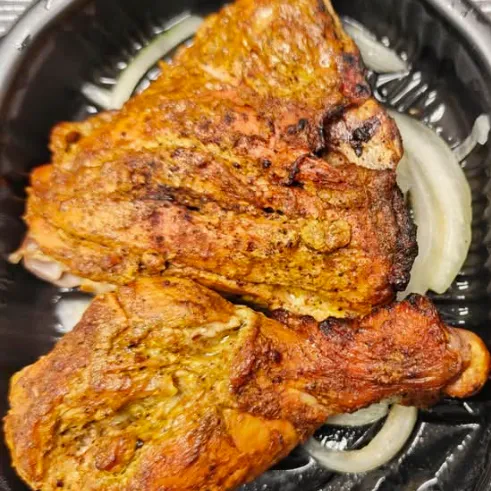 Pollo deshuesado marinado con especias, cocinado en tandoor y servido con chutney.