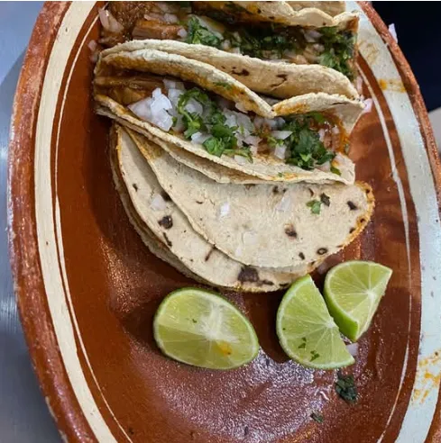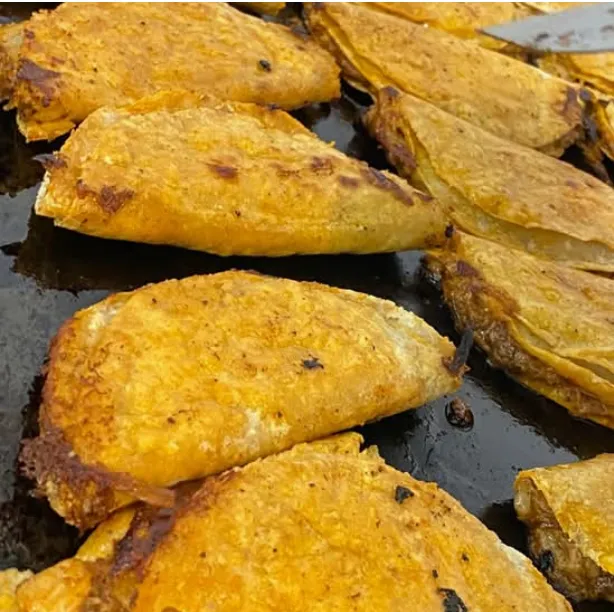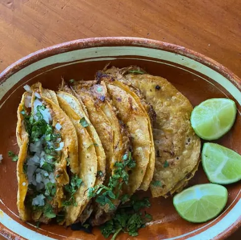 Tortilla de maíz dorada con barbacoa de res, acompañado de cebolla, cilantro, salsa de tomate con chile y salsa de chile de árbol picosa.