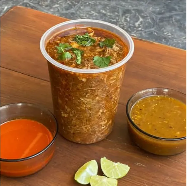 Caldo de barbacoa de res concentrado en vaso de 6 oz, acompañado de cebolla, cilantro, salsa de tomate con chile y salsa de chile de árbol picosa.