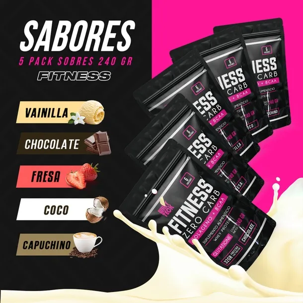 Proteína de suero de leche formulada con colágeno hidrolizado y aminoácidos que complementa las proteínas del tejido rojo y blanco (cartílagos, huesos, ligamentos, tendones y articulaciones). Esta fórmula sin azúcar y libre de lactosa te brinda 32 gramos de pura proteína en cada porción con cero carbohidratos y cero grasas. Los 5 Pack Fitness Sobres son la opción perfecta para quienes buscan una fuente de proteína de alta calidad en presentaciones individuales y convenientes. Cada sobre contiene 240 g de proteína de suero de leche aislada, formulada con colágeno hidrolizado y aminoácidos esenciales para apoyar el crecimiento y la recuperación muscular. Sin azúcar y libre de lactosa, es ideal para quienes buscan una nutrición limpia y efectiva. |