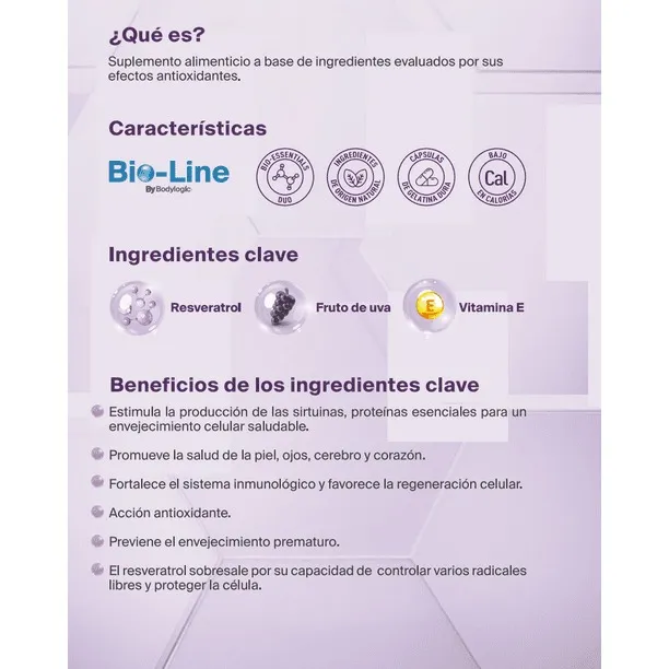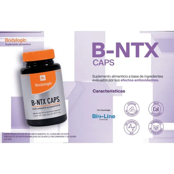 B-NTX Bodylogic son capsulas con resveratrol y Vitamina E, poderoso antioxidante natural, con propiedades que ayudan al sistema cerebral, ocular e inmunológico. B-NTX Bodylogic son capsulas con resveratrol y Vitamina E, poderoso antioxidante natural, con propiedades que ayudan al sistema cerebral, ocular e inmunológico. Beneficios Estimula la producción de las sirtuinas, proteínas esenciales para un envejecimiento celular saludable. Promueve la salud de la piel, ojos, cerebro y corazón. Fortalece el sistema inmunológico y favorece la regeneración celular. Acción antioxidante. Previene el envejecimiento prematuro. El resveratrol sobresale por su capacidad de controlar varios radicales libres y proteger la célula. Modo de uso Tomar 1 capsula por la mañana o por la noche. Consejos Se puede tomar en conjunto con B-IOCEL para mejorar los beneficios. Presentación Envase con 60 capsulas |