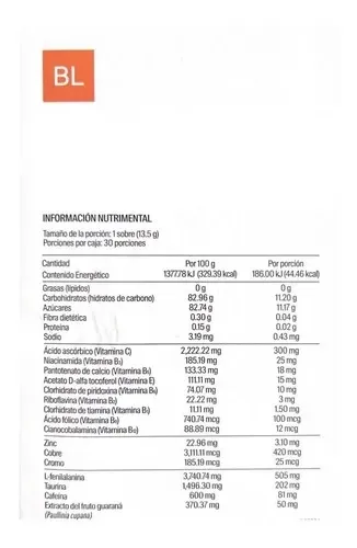B-PWR Mezcla de aminoácidos, vitaminas del complejo B y guaraná. Peso de la unidad: 13 g Unidades por pack: 30 Sabor: Naranja Tipo de envase: Caja Suplemento de uso nutricional/deportivo. Tamaño de la porción: 13.5g. Libre de gluten y lactosa. Producto vegano. Edad mínima recomendada: 18 años. |