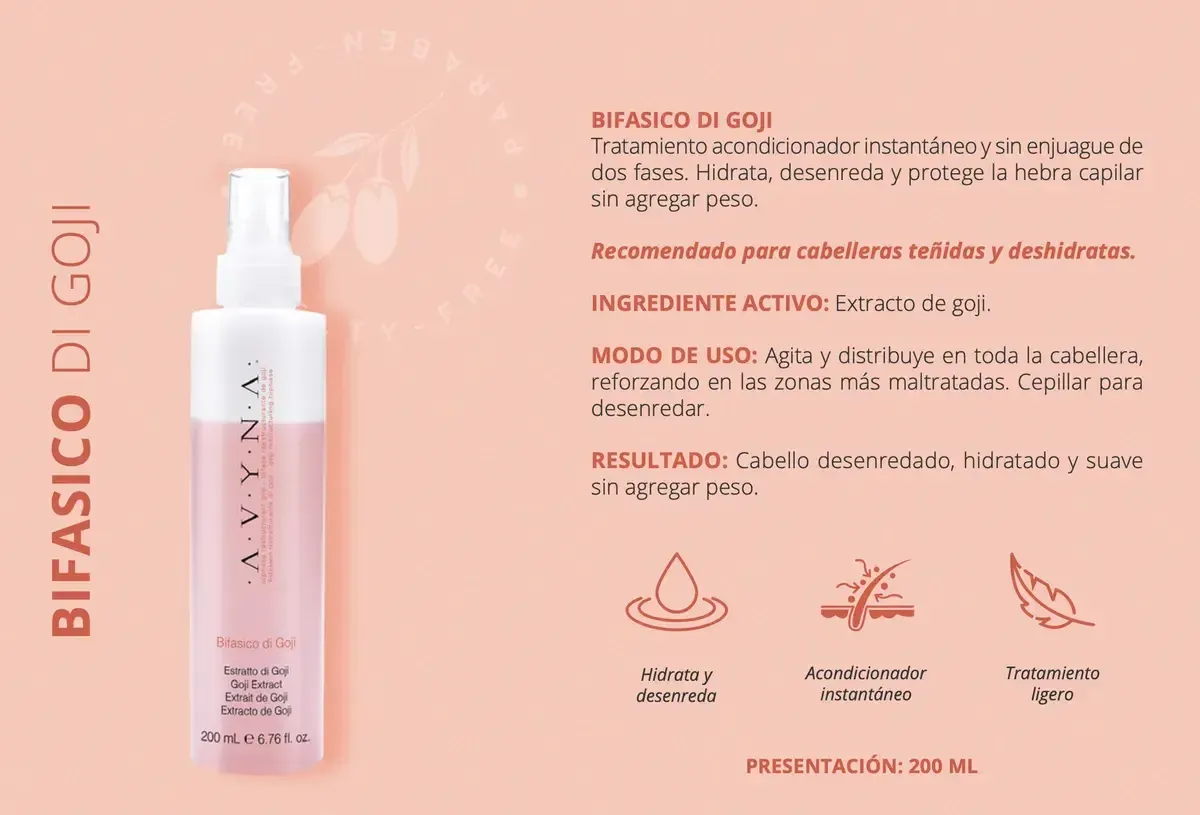 BIFASICO DI GOJI Tratamiento acondicionador instantáneo y sin enjuague de dos fases. Hidrata, desenreda y protege la hebra capilar sin agregar peso. Recomendado para cabelleras teñidas y deshidratas. INGREDIENTE ACTIVO: Extracto de goji. MODO DE USO: Agita y distribuye en toda la cabellera, reforzando en las zonas más maltratadas. Cepillar para desenredar. RESULTADO: Cabello desenredado, hidratado y suave sin agregar peso. |