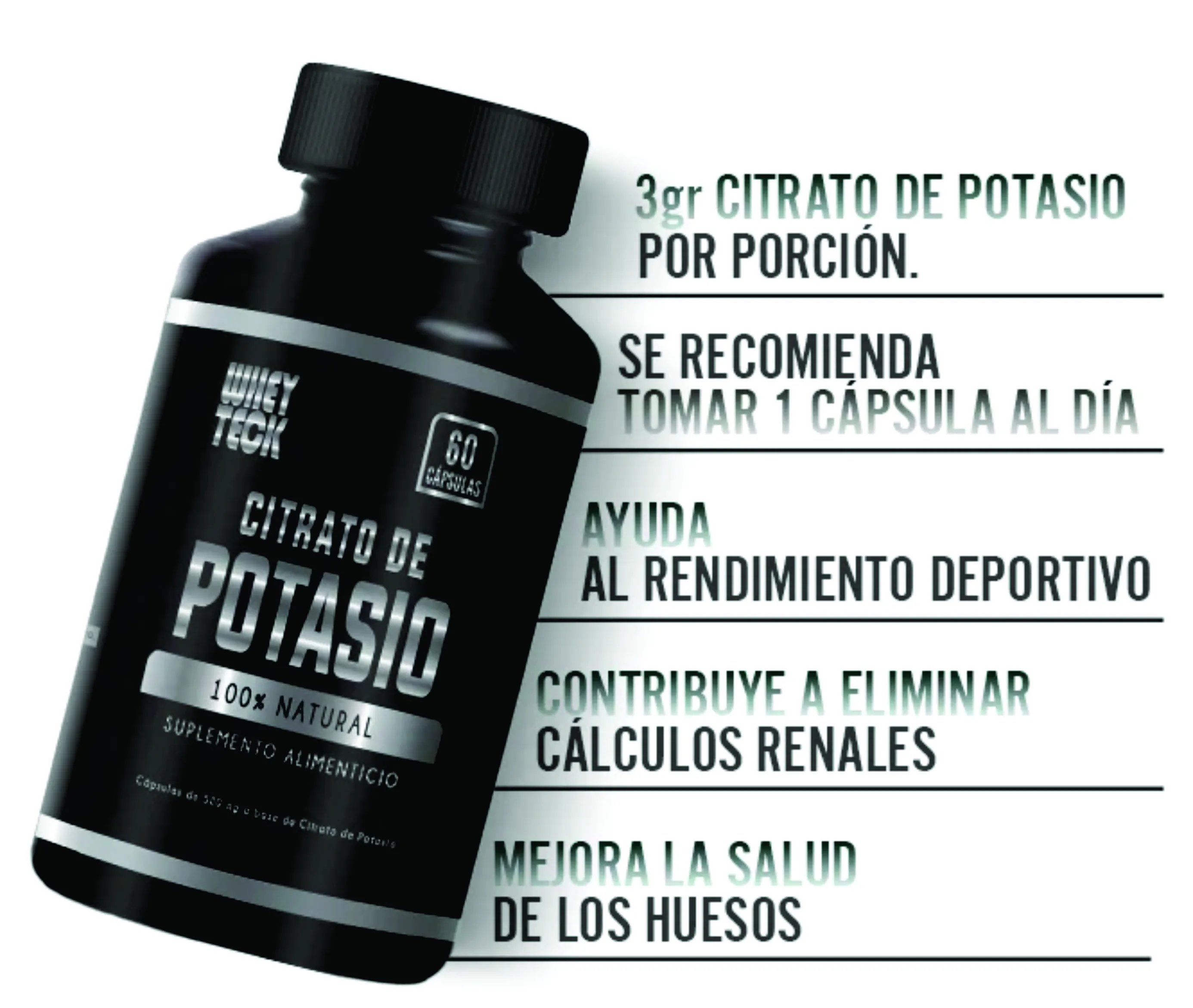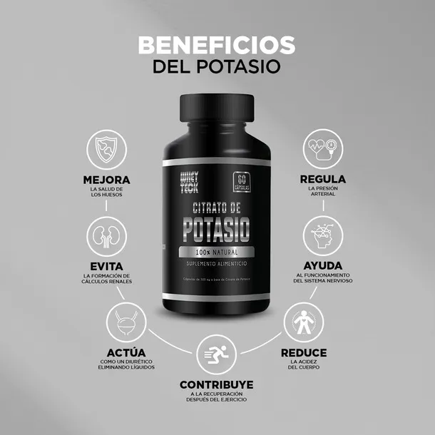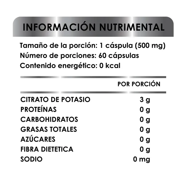 INGREDIENTES: Citrato de Potasio 100% puro RECOMENDACIONES DE USO 1. Consuma 1 cápsula durante el día junto con cualquier alimento. 2. Aumente su hidratación. 3. Complemente este suplemento con una dieta equilibrada. El citrato de potasio mejora la salud del corazón y los huesos, ayuda a mejorar la función renal y disminuye los problemas de presión arterial. El Citrato de Potasio es una forma altamente biodisponible de potasio, un mineral esencial para diversas funciones corporales. Este suplemento es especialmente útil para quienes buscan mantener un equilibrio electrolítico adecuado, apoyar la salud renal y cardiovascular, y prevenir calambres musculares. Contenido 60 Cápsulas |