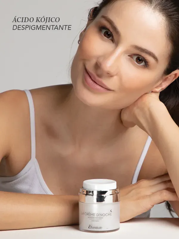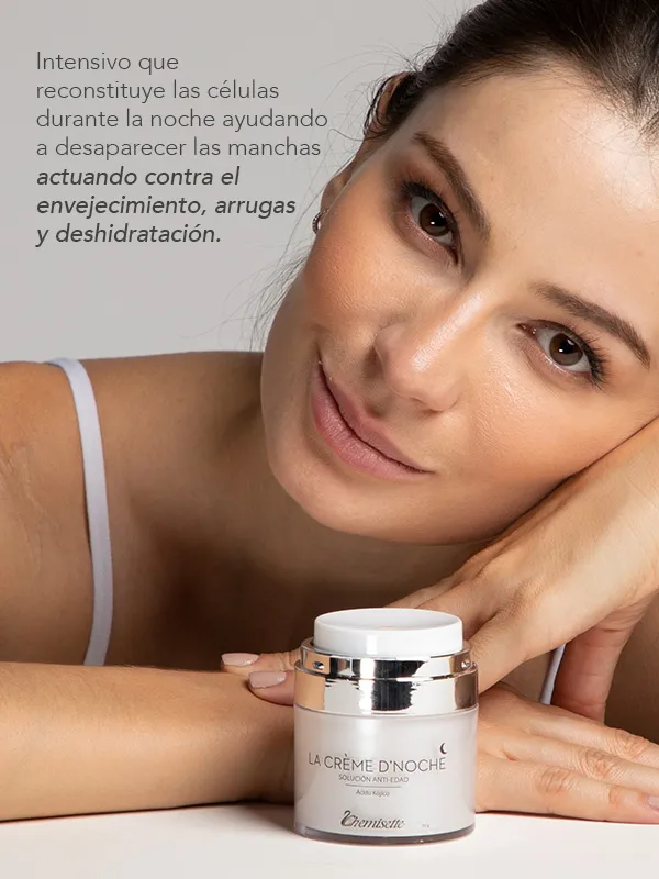 DESCRIPCIÓN: Hidratante facial anti edad con efecto ultralift que reconstituye las células de la piel del rostro durante la noche, ayudando a tener una piel luminosa con tono uniforme evitando las manchas. Alta concentración de ingredientes activos como Ácido Kójico, Ácido Hialurónico, Péptidos Hidrolizados, Colágeno, Elastina, Antioxidantes, Minerales y Aceite Esencial de Geranio. MODO DE USO: