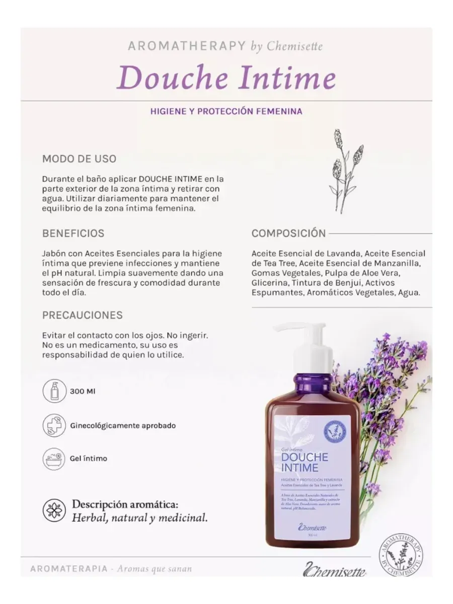 MODO DE USO Durante el baño aplicar DOUCHE INTIME en la parte exterior de la zona íntima y retirar con agua. Utilizar diariamente para mantener el equilibrio de la zona íntima femenina. BENEFICIOS Jabón con Aceites Esenciales para la higiene íntima que previene infecciones y mantiene el pH natural. Limpia suavemente dando una sensación de frescura y comodidad durante todo el día. PRECAUCIONES Evitar el contacto con los ojos. No ingerir. No es un medicamento, su uso es responsabilidad de quien lo utilice. COMPOSICIÓN Aceite Esencial de Lavanda, Aceite Esencial de Tea Tree, Aceite Esencial de Manzanilla, Gomas Vegetales, Pulpa de Aloe Vera, Glicerina, Tintura de Benjui, Activos Espumantes, Aromáticos Vegetales, Agua. |