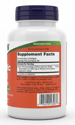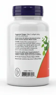 El Garlic Oil de NOW Foods ofrece los beneficios tradicionales del ajo en una forma concentrada y altamente biodisponible. Cada cápsula contiene aceite de ajo puro equivalente a múltiples dientes de ajo fresco, proporcionando compuestos sulfurosos naturales que favorecen la salud del corazón, la circulación y el sistema inmunológico. Modo de uso sugerido: Tomar 1 cápsula 1 a 3 veces al día, preferentemente con alimentos. |