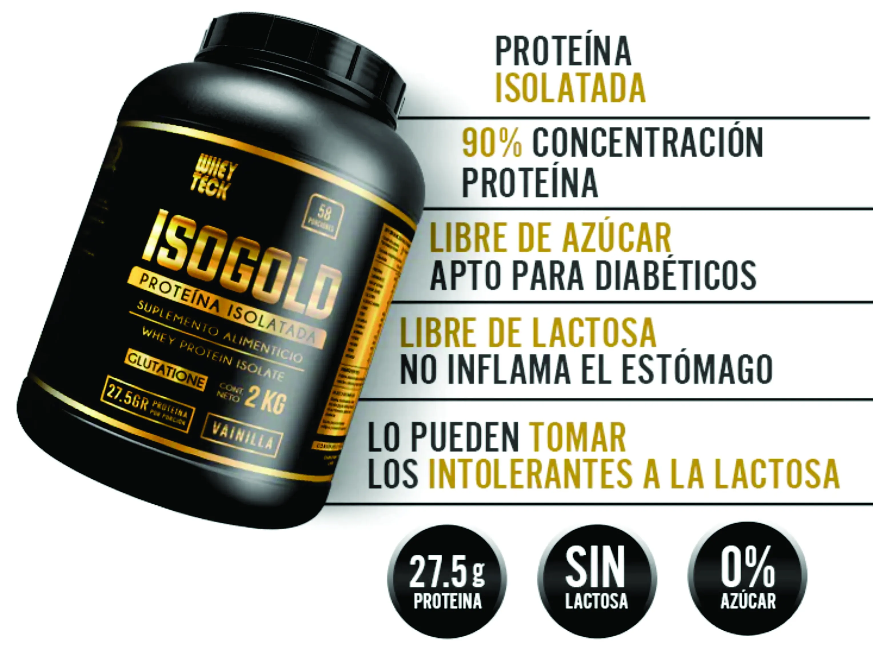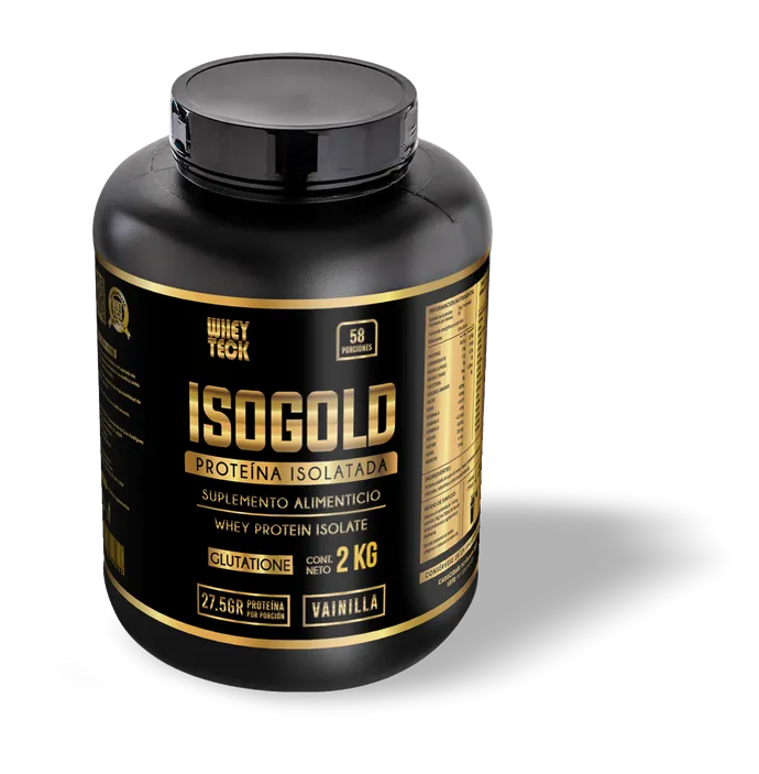Es una proteína isolatada, libre de grasa y de lactosa, de fácil y rápida asimilación, con una concentración del 90% de proteína, ideal para la definición muscular. Esta fórmula sin azúcar y libre de lactosa te brinda 27.5 gramos de pura proteína en cada porción. Su sabor es muy agradable y muy delicioso, ¡estamos seguros que te va a encantar! IsoGold es una proteína de suero de leche de alta calidad, formulada para quienes buscan optimizar su rendimiento físico, acelerar la recuperación muscular y mejorar su composición corporal. Con una concentración superior al 90% de proteína por porción, IsoGold es ideal para la definición muscular y el desarrollo de masa magra. Su fórmula avanzada incluye aislado e hidrolizado de suero, probióticos, BCAA's, EAAs y MCTs, garantizando una absorción rápida y eficiente. INGREDIENTES: Concentrado de proteína isolatada de suero de leche Stevia Formulación de vitaminas y minerales Colorantes y saborizantes naturales |