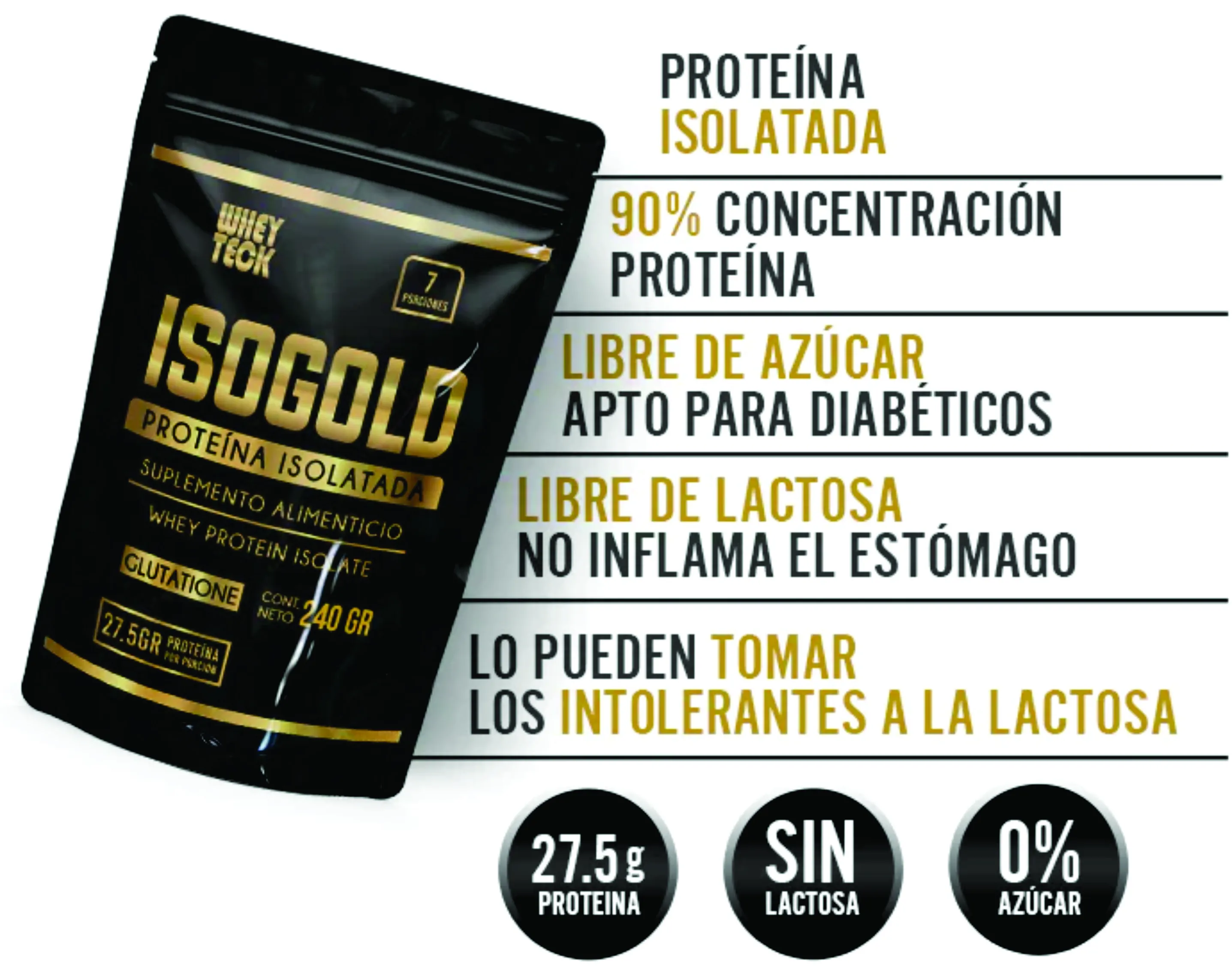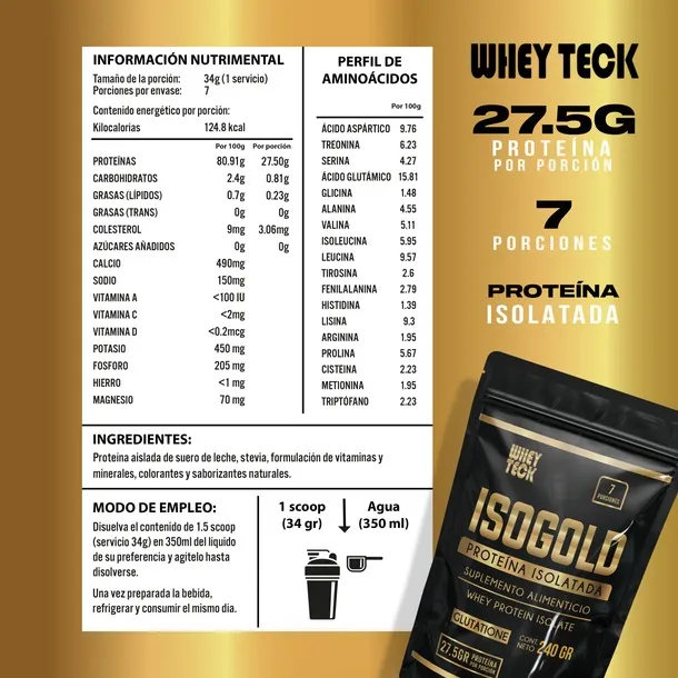 Es una proteína isolatada, libre de grasa y de lactosa, de fácil y rápida asimilación, con una concentración del 90% de proteína, ideal para la definición muscular. Esta fórmula sin azúcar y libre de lactosa te brinda 27.5 gramos de pura proteína en cada porción. Su sabor es muy agradable y muy delicioso, ¡estamos seguros que te va a encantar! IsoGold es una proteína de suero de leche aislada de alta calidad, diseñada para quienes buscan optimizar su rendimiento físico, acelerar la recuperación muscular y mejorar su composición corporal. Con una combinación de aislado e hidrolizado de suero, esta fórmula avanzada ofrece una absorción rápida y eficiente. Enriquecida con probióticos y BCAA's, esenciales para la síntesis de proteínas y la recuperación muscular. |