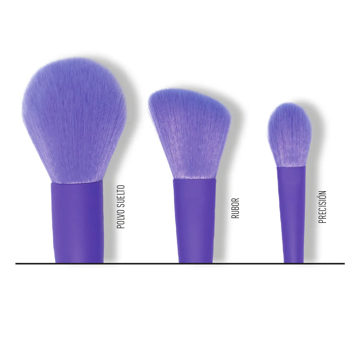 Incluye: - Brocha para polvo suelto - Brocha para rubor - Brocha de precisión |
