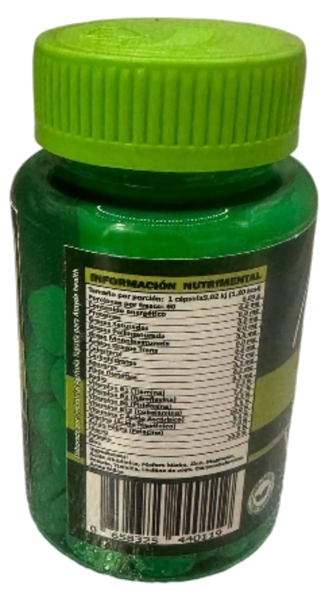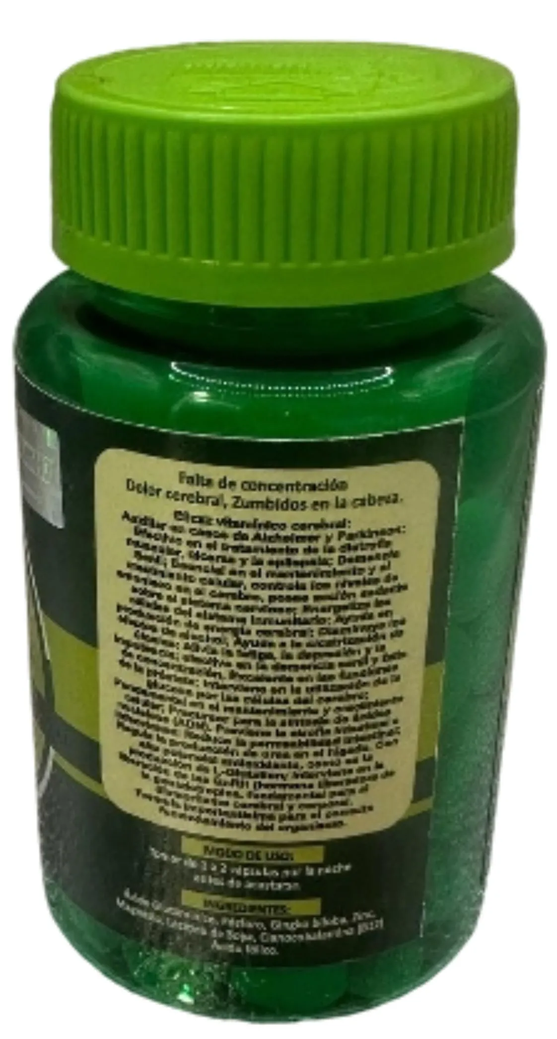 Nota: Los porcentajes parecen referirse al Valor de Referencia de Nutrientes o cantidad por cápsula según el formato de la etiqueta). Ingredientes: Ácido Glutámico, Fósforo biloba, Zinc, Magnesio, Potasio, Tiamina, Lecitina de soya, Cianocobalamina, Ácido Fólico.