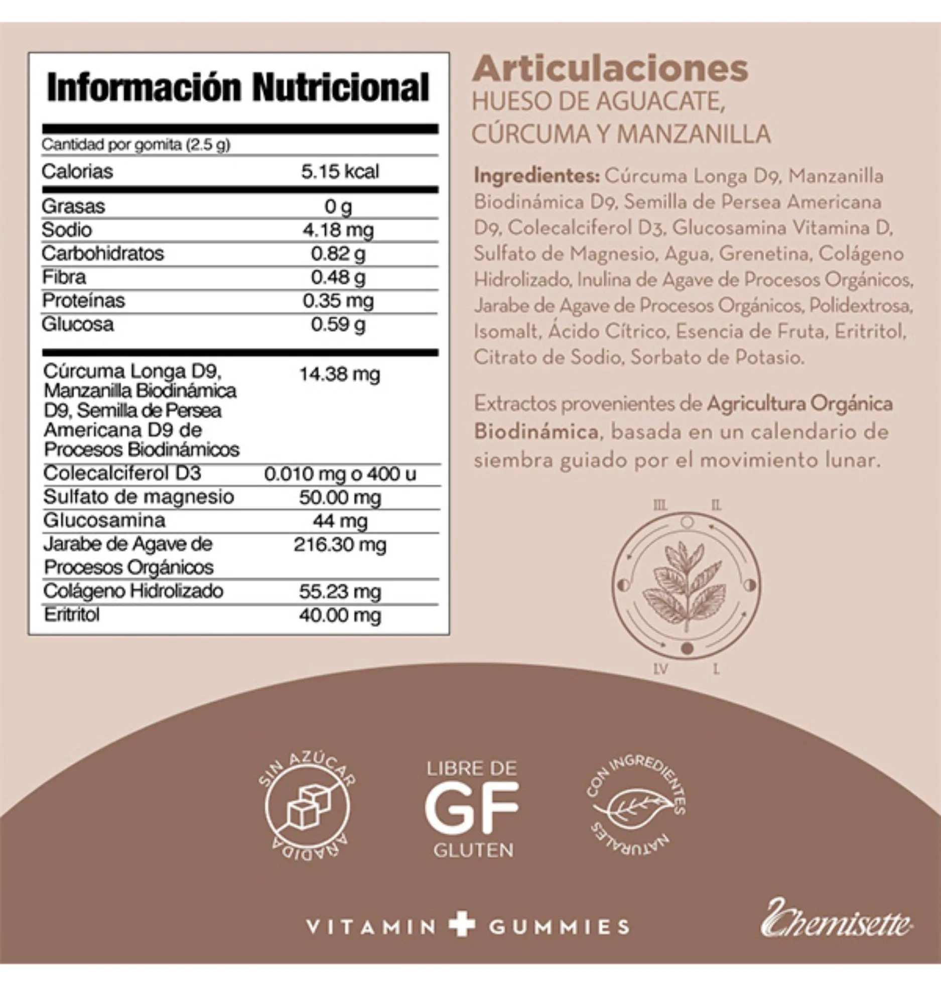 BENEFICIOS: Ayudan a tratar diariamente el dolor y la inflamación en las articulaciones. Auxiliar en contracturas por estrés o esfuerzo físico, para desinflamar músculos, tendones y cartílagos. Contiene propiedades antiinflamatorias y antioxidantes que estimulan la regeneración de tejidos. Hechas con Hueso de Aguacate, Cúrcuma vivificada y Manzanilla Biodinámica. MODO DE USO: Masticar 2 gomitas 3 veces al día. |