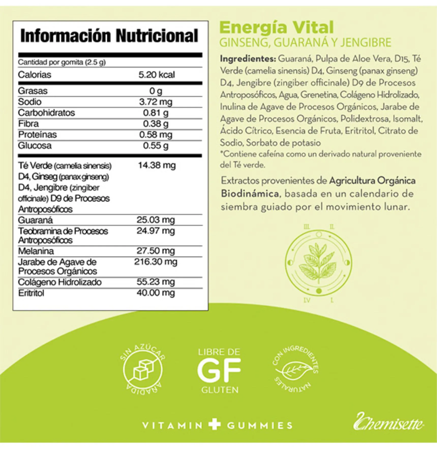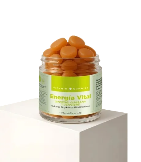 BENEFICIOS: Mejora tu rendimiento diario y aumenta tu energía combatiendo el cansancio y la fatiga de una manera natural gracias a sus activos como: Ginseng, Guaraná, Jengibre y Té Verde. No contienen azúcar añadida, libres de gluten, sin taurina. MODO DE USO: Masticar 1-2 gomitas por la mañana.