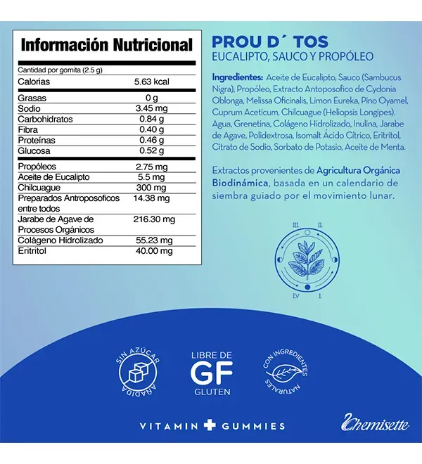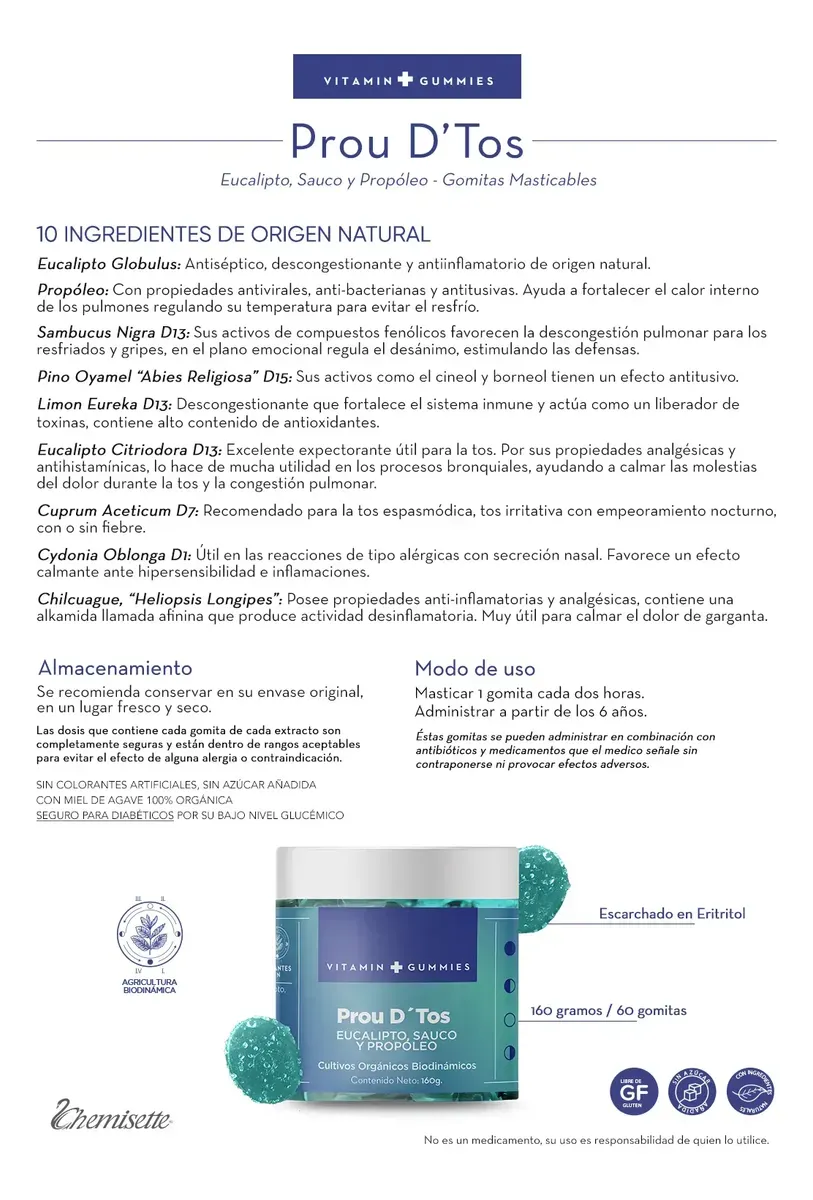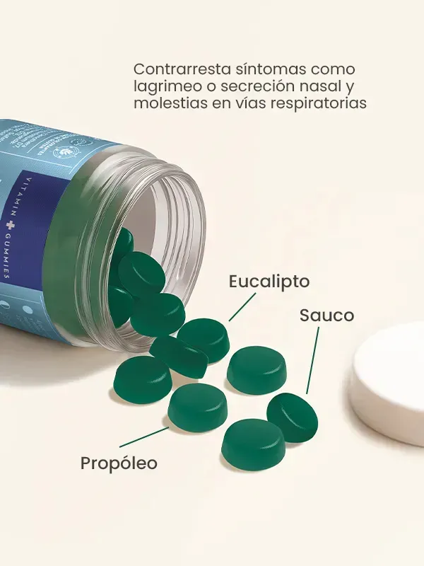 BENEFICIOS: Ayudan contra la irritación de garganta, tos, carraspera, dolor y congestión. Contrarrestan otros síntomas como lagrimeo, secreción nasal y molestias de vías respiratorias. MODO DE USO: Masticar 1 gomita cada 2 horas.